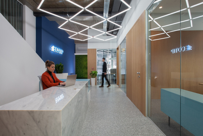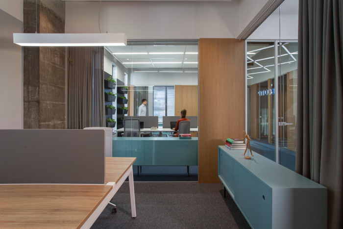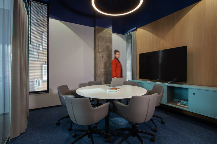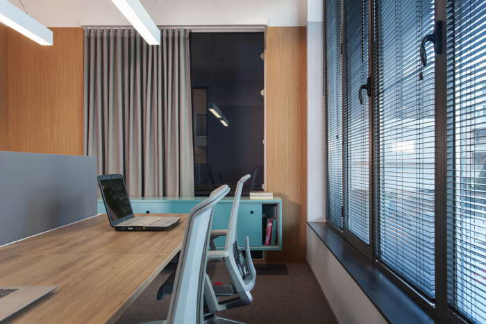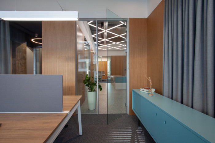 由于客户组织结构的特殊需要,楼层平面图设计为独立的办公单元,允许小型团队的隐私。墙壁隔板上的垂直玻璃开口形成了独立单元之间的视觉连接。墙壁上的这些“裂缝”使工作空间区域更紧密地相连,也让室外光线在整个区域流通。每个玻璃隔板上都有一个窗帘,使员工有可能将自己隔离开来。窗帘也起到吸音的作用。更高的服务区创造了一个较小的规模,在厨房的亲密气氛,这也是一个会议室,为更多的非正式公司会议。该区域还设有一个小角落,展示公司产品。