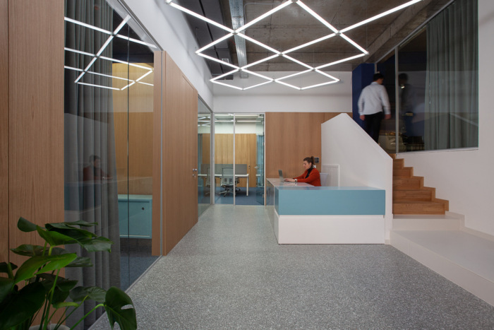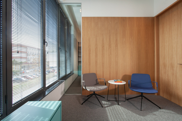墙壁和门的天然橡木覆盖层、工作空间区域的水磨石和地毯砖、厨房区域的木地板和粉彩绿松石色的简单橱柜,使材料的色调更加完整,突出了简单材料的内在美。这些材料通过一整天从迷你百叶窗上落下的自然光和阴影增强,创造出一个平静而充满活力的环境,激发协作、创造力和生产力。