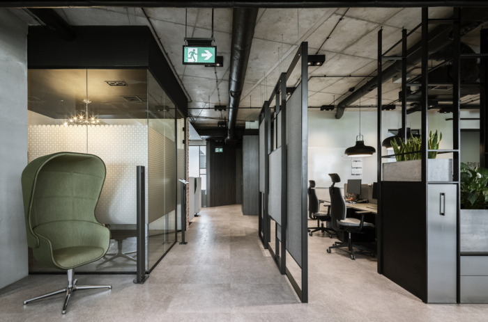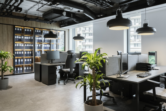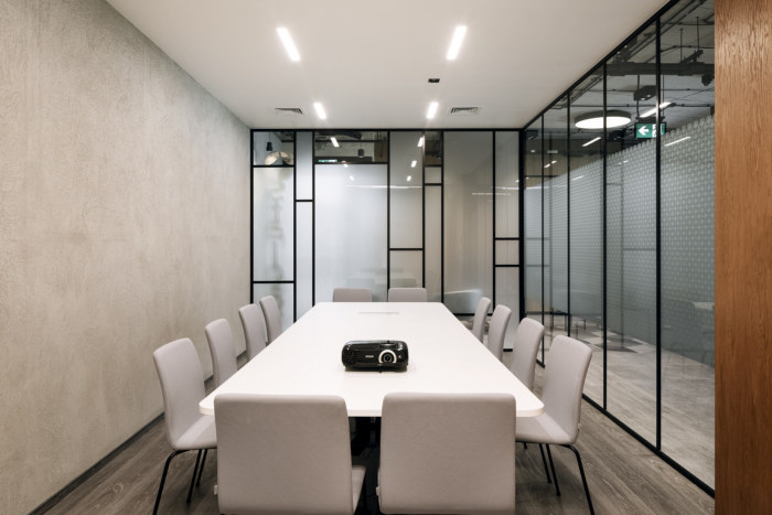 该办公室有一个开放空间计划,但已制定了一种方式,使每个部门都有自己的隐私。为了实现这一点,玻璃墙的位置以及装饰毡隔音板。