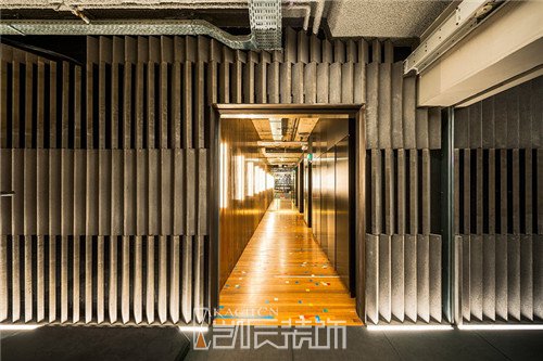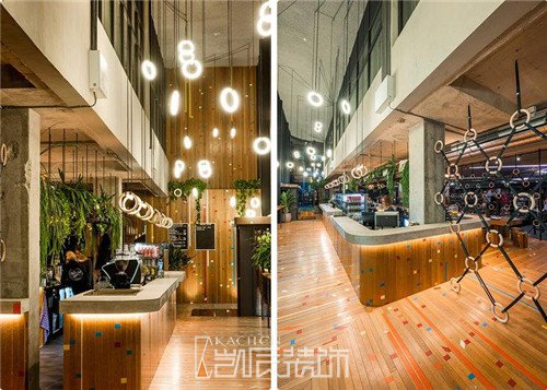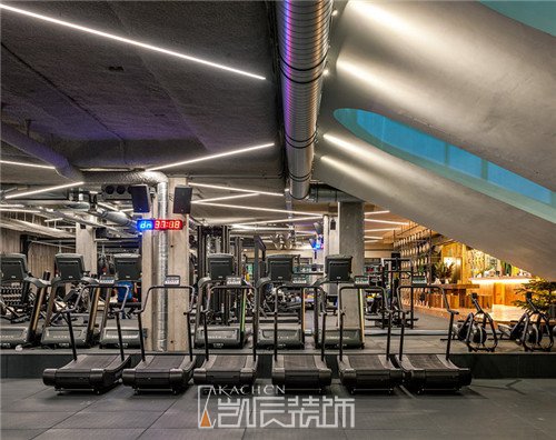 巨大的开放空间需要在社交和健身区域之间进行创造性的划分:将社交空间的温暖色调与健身区域的凉爽、清醒色调并列,形成一个清晰的图形化空间划分。开放式布局、品牌认同和社区概念也意味着需要一个美学的噪音管理解决方案。混凝土瓦和钢筋网吸收噪音,降低噪音环境的强度。