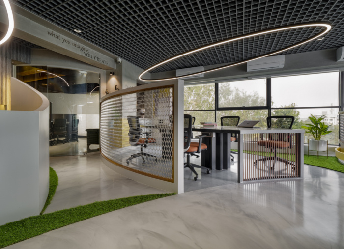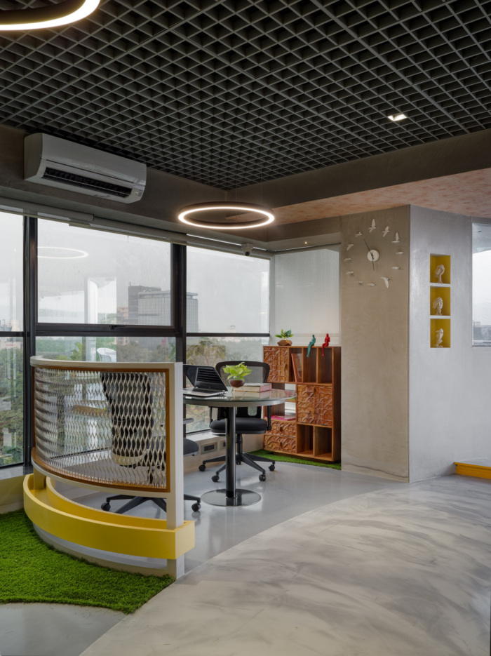 在人工草皮的帮助下触摸绿地,起到泡腾和快速提升的作用,增加工作生产力。很少小木屋被彩色地板和极简家具照亮,使空间突然升高。钢筋的使用,这不仅有助于桌子的支持,而且增加了光滑的给定的桌子大小,使设计更轻和宽敞。