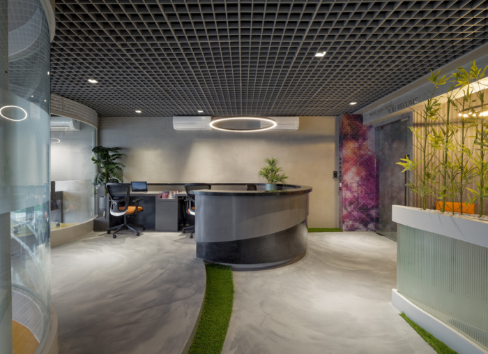 一个不同的材料托盘已经处理,唯一的想法是带来新的设计,不仅在其空间组织方面,也在其材料属性。使用了PVC面板、杜邦科里安、工业环氧地板、金属灰色开放式网格天花板、人造草坪、线切割砖、数控切割钛字母、玫瑰金金属镶嵌物、8mm桌子支架钢筋,帮助我们提升了办公室的美观。