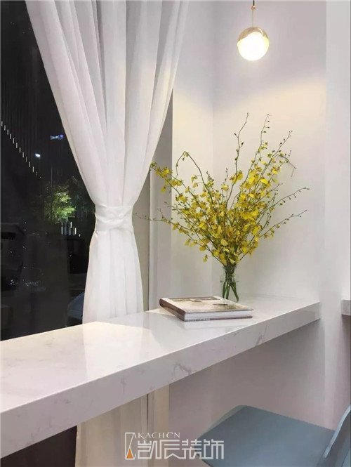 旭彩网 为防止西晒使得堂食区温度过高,设计师特地在玻璃门前设计了半朦胧状又不失温馨感的白色纱帘。