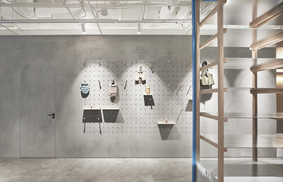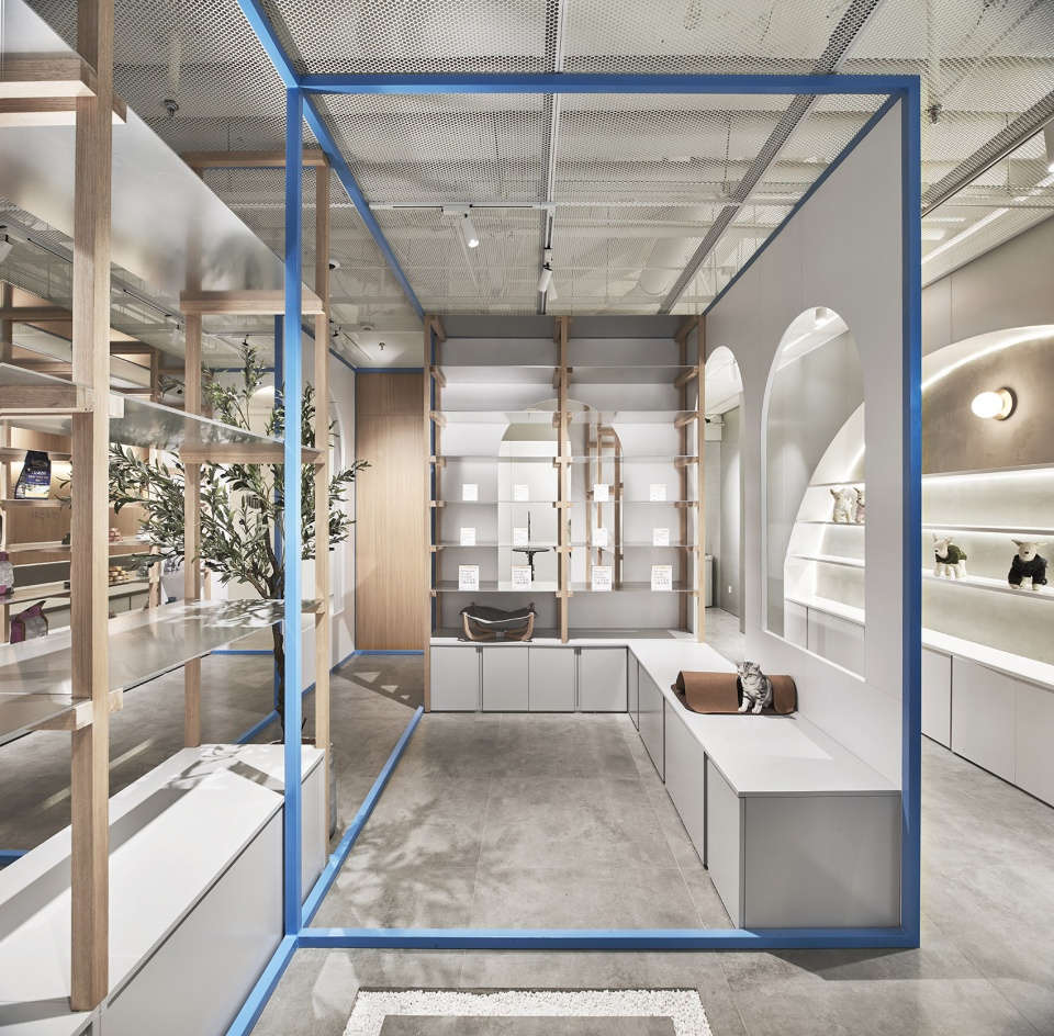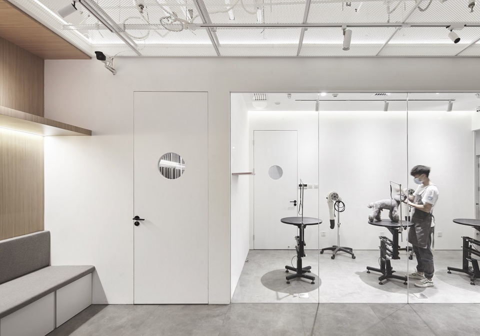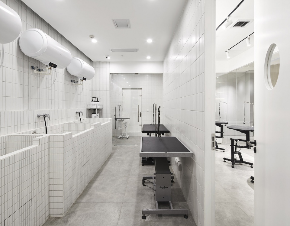 售卖商品的陈列架采用榫卯细节的木框架与具有现代感的阳极氧化铝板结合在一起,洗练而又不失品质感。宠物洗澡区一般都是使用大面积具有洁净感的白色细纹砖,防潮容易清理。