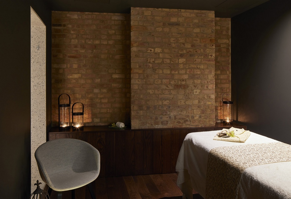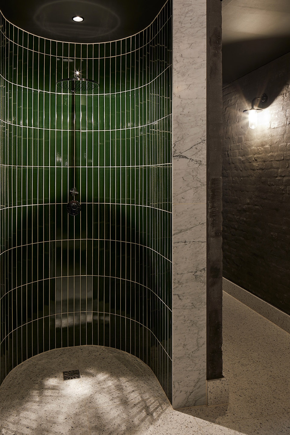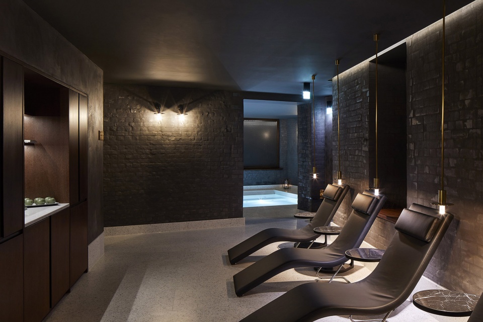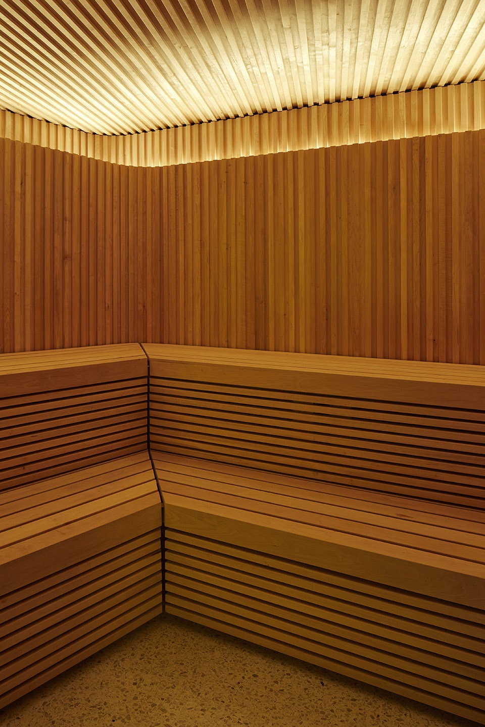 首先大理石和白色水磨石为地板和过渡区域创造出一系列明亮豪华的表面,与昏暗的香氛放松区和理疗按摩室形成了鲜明的对比。香氛放松区局部,采用昏暗的空间色调,原有的砖墙结构暴露在外,采用水磨石地面;理疗按摩室,暴露出原结构的砖墙结构和纹理;办公室可以采用胡桃木制成的门;发光的活力泳池环绕着酒店原有的砖结构支柱,创造出两个隐蔽的浴池,其中配有内置的水下长椅和按摩喷头。湿蒸房采用连续的滚花卡拉拉大理石作为饰面,而桑拿房则采用木材的实心部分作为饰面,这部分木材已经经过了热处理,从而能够为室内空气注入几缕木材的清香,发光的活力浴池,配有内置的水下长椅和按摩喷头。最重要的桑拿房,采用实心木材作为饰面,而湿蒸房,采用连续的大理石饰面。
