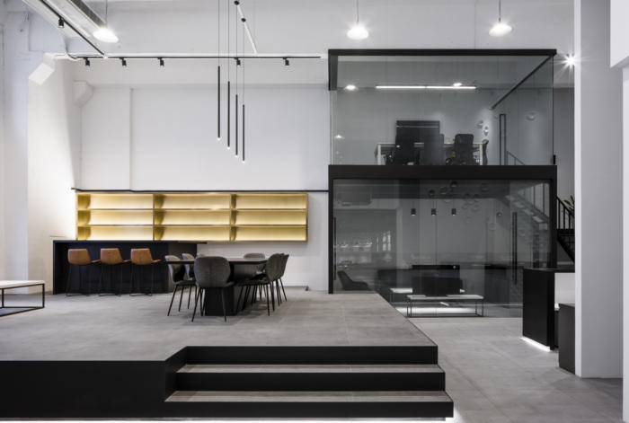 公共区域是办公室和陈列室合二为一的地方。这座建筑的整个高度隐约可见,它是一个开放和灵活的平台,旨在用作内部会议以及面向公众的小组讨论、讨论和产品发布的容纳空间。