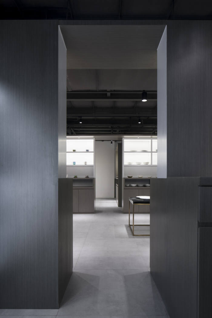 灰木面板和彩钢的流行深灰色色调为背光展示架提供了一个不显眼的背景,使每个产品脱颖而出,同时允许从主走廊对整个系列进行概述。眼睛首先落在如意,该公司的旗舰瓷器收藏,而其他产品系列展示在双方较小的,相互联系的凹处。