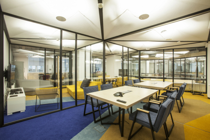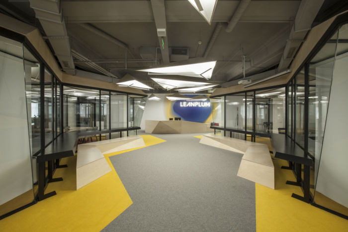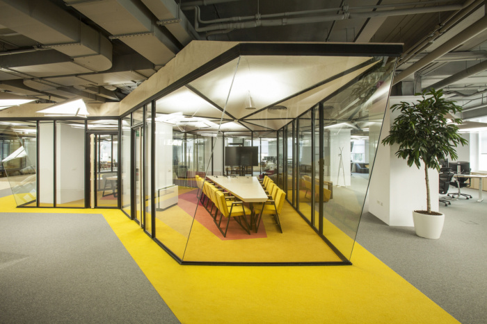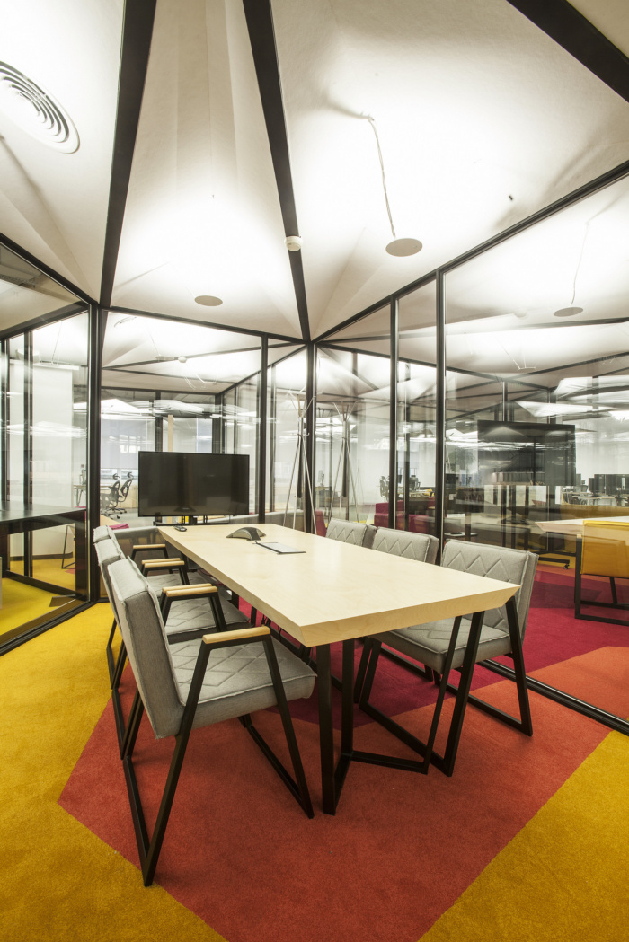 随着新的空间元素的引入,传统的工作场所被重新改造,例如会议室作为“房子”,开放的会议区作为“广场”。这些元素的重复和彩色地毯图案定义了“城市区域”,促进非正式的团队合作、有意义的联系和创新。